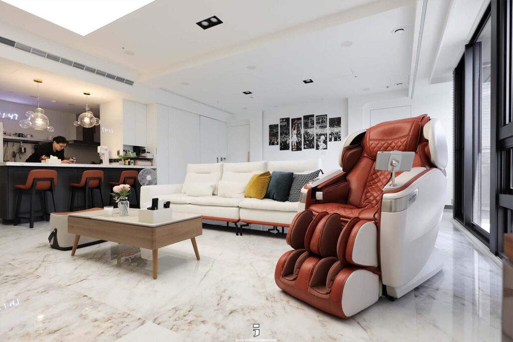 客廳這邊透過材質切換與線條分割,